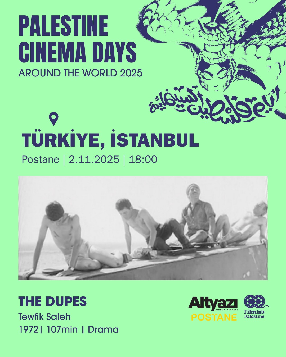 Birçok ülkede sansüre uğrayan, Tewfik Saleh imzalı ‘Aldatılmışlar’ (Al-makhdu'un / The Dupes, 1972) filmi, 2 Kasım Pazar günü iki farklı mekânda arka arkaya gösterilecek. İlk gösterim saat 18:00’de Postane’de, ikinci gösterim ise saat 20:30’da Parmakültür’de yapılacak.